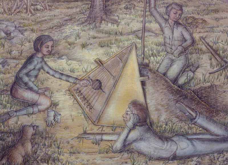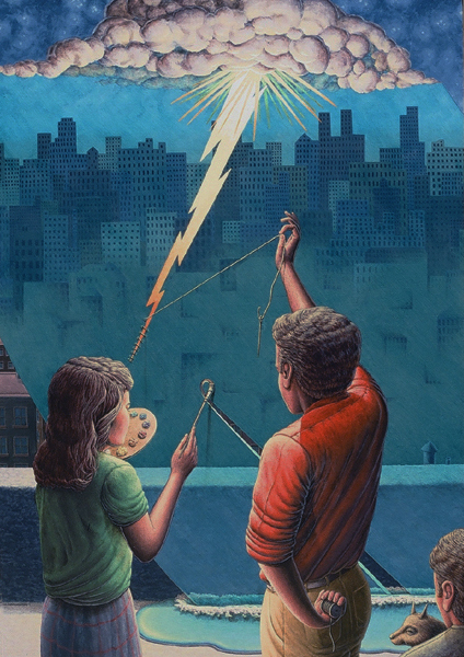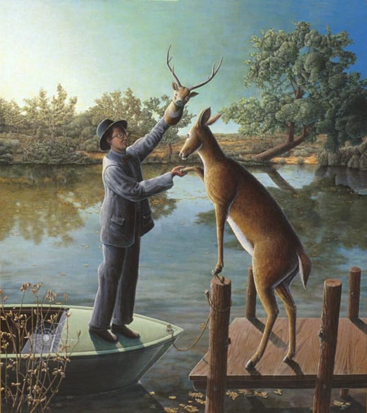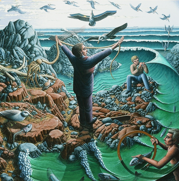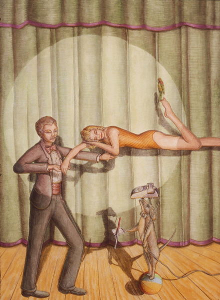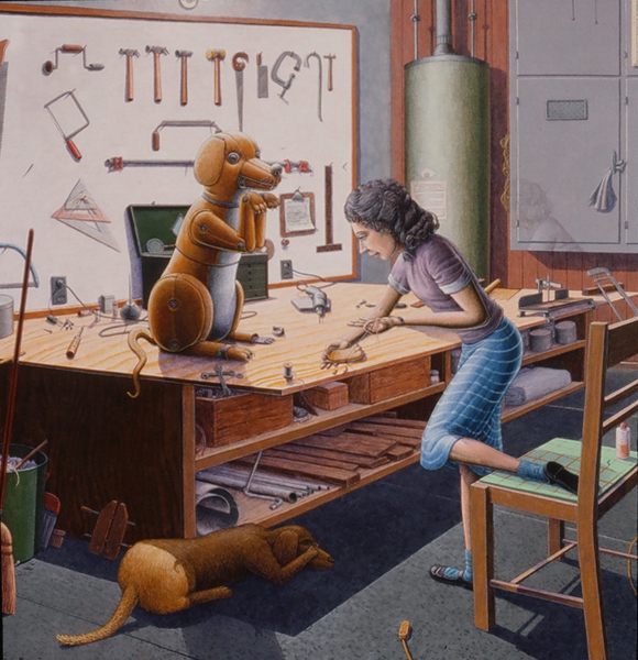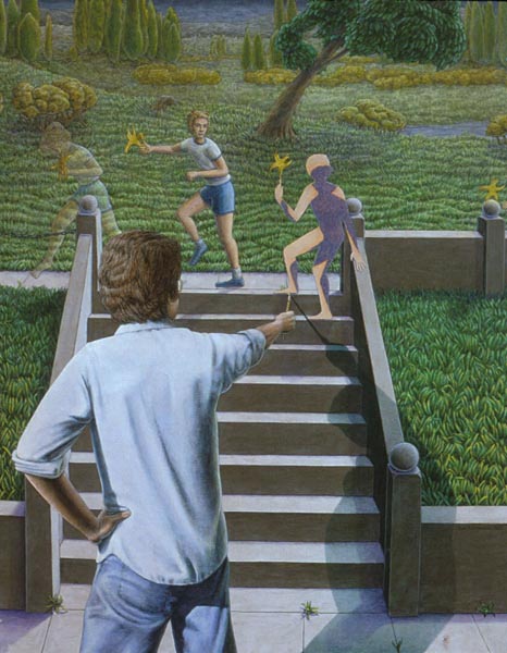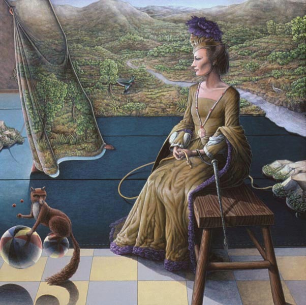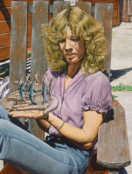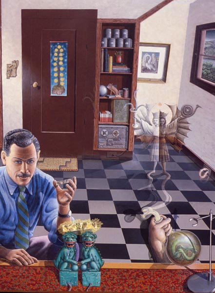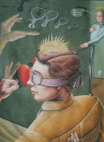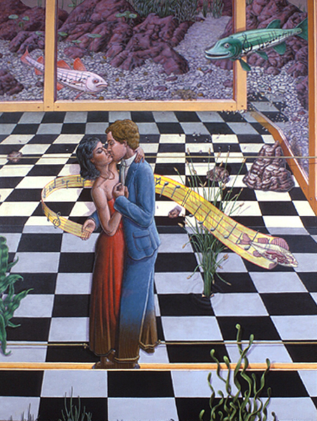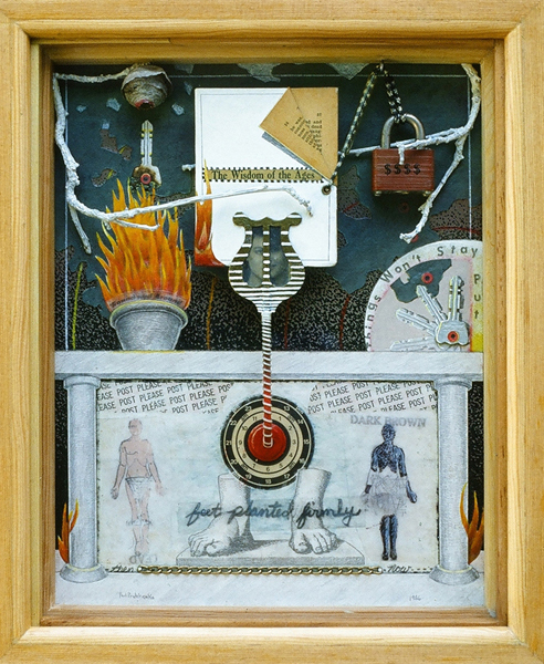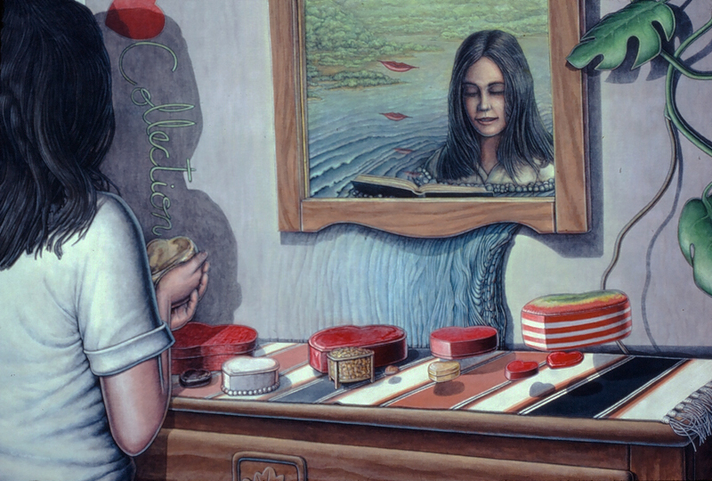 Periphery, 1989, Acrylic on Canvas, 45x 51.5 in.Listening Lamp, 1988, M-M Construction, 16x11x15.5 in.Inevitability of Forward Momentum, 1988, Charcoal, Acrylic, Prismacolor on Rag Paper, 26x38 in.Master Choreographer at the Seashore, 1987, Acrylic on Canvas, 65x65 in.Falling From Grace the Ties That Bind, 1987, Acrylic on Canvas, 51x60 in.On the Edge, 1987, Acrylic on canvas, 53 x53 in.Making Art from Adverse Conditions, 1986, Acrylic on Canvas, 51x36 in.Wisdom of the Ages Feet Planted Firmly, 1986, M-M Collage, Construction, 14x16x3 in.Kite, Charcoal, Watercolor, 1986, Prismacolor on Rag Paper, 21x30 in.Our Lady of the Housework, 1985, Acrylics on canvas, 60x42 in.Valentine for the Three Graces, 1985, Collage, Acrylic, M-M, Vinyl Decal on Masonite, 5x8.5 in.Nature of Deception - Deception of Nature, 1985, Acrylic on Canvas, 74x67 in.Leadership-Destination-Velocity, 1985, Acrylic, Prismacolor, Graphite on Rag Paper, 30x42 in.Believing Half What They See, 1984, Acrylic on Canvas, 40x57 in.Kiss in Time, 1984, Collage, M-M, Vinyl Decal, Acrylic on Masonite, 8.5x5 in.Portrait of Self-Portrait, 1984, M-M Construction, 18x10x8 in.Difference between Mirage and Oasis, 1984, Acrylic and Prismacolor on Rag Paper, 22x30 in.Bit of Life in a Fish Tank, 1983, Acrylic on Canvas, 41x30.5 in.Possibility of Expulsion from the School for Pirates, 1982, Graphite, Prismacolor and Watercolor on Rag Paper, 22 x30 in.Subtle Defiance Fits Overwhelming Odds, 1982, Acrylic on Canvas, 62x48 in.Triumph of Intuition over Logic, 1982, Graphite, Prismacolor on Rag Paper, 30x22 in.Self Portrait at 37, 1982, Acrylic on Canvas, 38x31 in.Phoenix by Firelight - Phoenix by Starlight, 1982, Acrylic on Canvas, 63x63 in.In Her Hands, 1981, Acrylic on Canvas, 36x27 in.In the Shadow of Child's Play, 1981, Acrylic on Canvas, 44x43 in.Children Discover Music, 1981, Acrylic, Graphite, Prismacolor on Rag Paper, 21x29 in.1-2-3 Alchemy, 1981, Acrylic on Canvas, 65x50 .inInterrupted Magic - Off Stage Cur, 1981, Acrylic, Charcoal, Prismacolor on Rag Paper, 21x29 in.Heart Collection, 1980, Acrylic on Canvas, 24x36 in.Free Choice, 1980, Acrylic, Prismacolor, Charcoal on Rag Paper, 29x21 in.Margie as Queen of the Hunt, 1980, Acrylic on Canvas, 42x42 in.Let Them Eat Technology, 1980, Acrylic on Canvas, 53x74 in.I Don't Want to French Kiss, 1980, Vinyl Decal, Collage, M-M on Masonite, 11x10.5 in.
