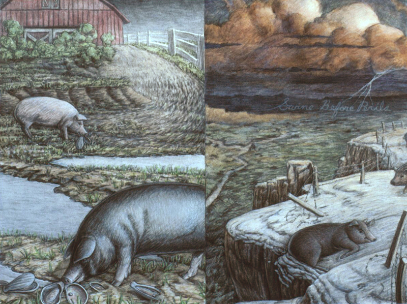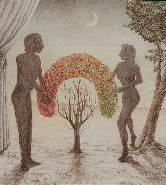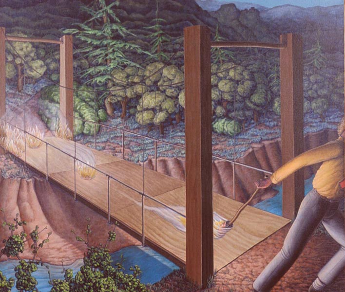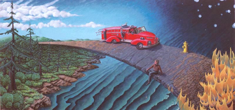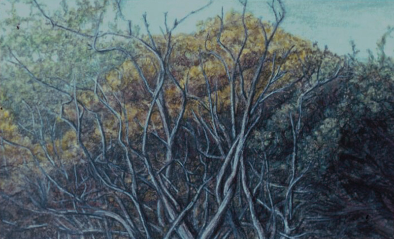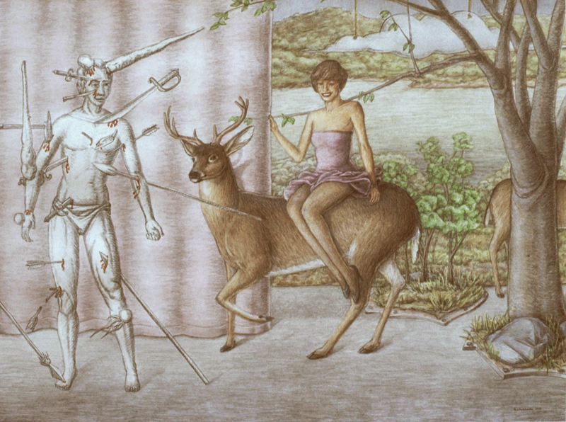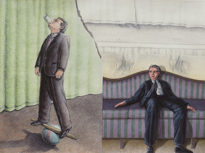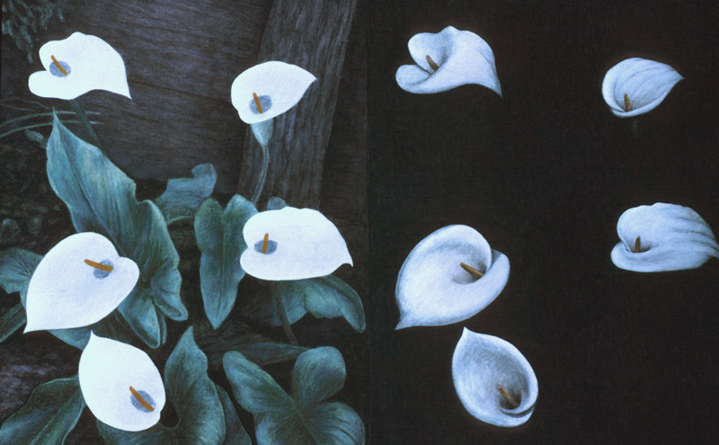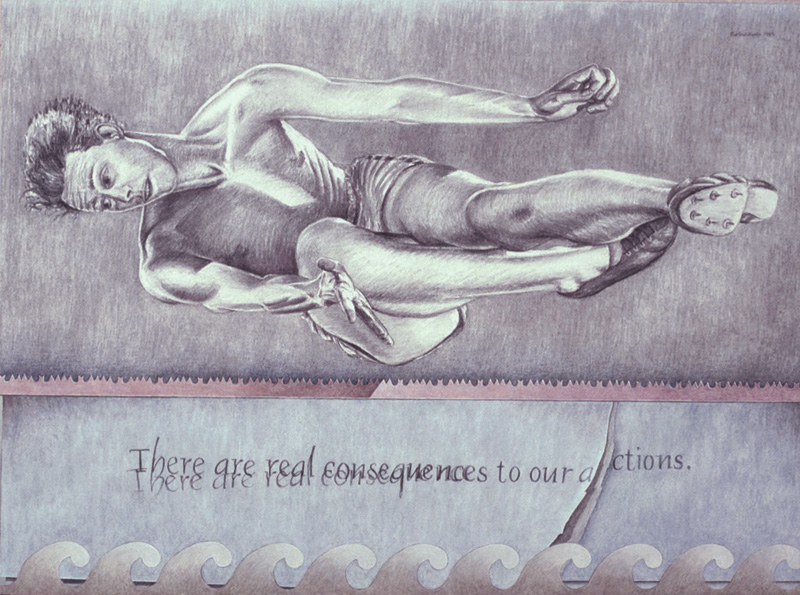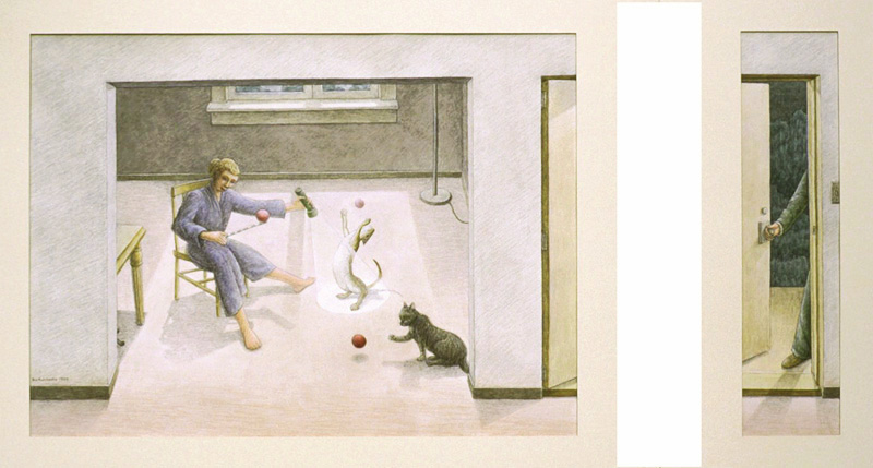 Cat Trick, 1999, M-M on Rag Paper, 90 Degree Diptych, 16x21 in. and 16x4 in.House of Cards, 1999, M-M on Canvas and Rag Paper, 34x34 in.Dissolution of the Familiar, 1999, Acrylic on Canvas, 24x42 in.Architectonics, 1998, Charcoal, Watercolor, M-M on Rag Paper, 23x35 in.Water Wears Rock, 1998, M-M on Rag Paper, 44x34 in.Domestic Reconstruction, 1998, Acrylic on Canvas, Diptych, 46x64 in.Midnight Gardening, 1998, M-M on Rag Paper, 29x27 in.Vulcanization 1998, Acrylic on Canvas, 39x33 in.Reflection X 3, 1998, Charcoal, M-M on Rag Paper, 25x35 in.Voyage, 1997, Charcoal and M-M on Rag Paper, 23x29 in.Change of Plan, 1997, Acrylic on Canvas, 44x64 in.Comparative Camouflage, 1996, Charcoal, Acrylic, M-M on Rag Paper, 19x30.5 in.Manifest Geometry, 1996, Charcoal, M-M on Rag Paper, 26x19 in.Relinquish, 1996, M-M on Rag Paper, 19x26.5 in.Miracle of the Ordinary, 1996, Acrylic on Canvas, 26x 64 in.Swan, 1995, Acrylic on Canvas, 40x64 in.Angelic Seduction, 1995, M-M on Rag Paper, 32.5x42.5 in.Joan of Arc, 1995, Collage on Rag Board with Graphite and Acrylic, 14x8.5 in.Plein-air Study #10, 1995, M-M on Rag Paper, 18x12 in.Plein-air Study #9, 1995, M-M on Rag Paper, 18x12 in.Plein-air Study #7, 1995, M-M on Rag Paper, 16.5x14.5 in.Temple of Developers, 1995, Acrylic on Canvas, 48x48 in.Afloat on Dreams, 1994, Acrylic on Canvas, 30x66 in.Polarities, 1994, Charcoal on Rag Paper, 29x23 in.Oarless, 1994, Acrylic on Canvas, 57x39 in.Rescue, 1994, Acrylic on Canvas, 48x48 in.Margie x 2, 1993, Acrylic on Canvas, 30x27 in.Plein-air Study #6, 1993, M-M on Rag Paper, 9.5x15 in.Plein-air Study #3, 1993, M-M on Rag Paper, 15x19 in.Plein-air Study #2, 1993, M-M on Rag Paper, 19x15 in.Plein-air Study #4, 1993, M-M on Rag Paper, 15x19 in.Venus de Washington, 1993, MM Collage on Rag Board, 12x6.5 in.Lost, 1993, Acrylic on Canvas, 63x 33 in.Sunset 1, 1993, Acrylic on Canvas, 27x36 in.Reforestation by Magic, 1993, Acrylic on Canvas, 65x65 in.Social Graces, 1993, Acrylic, Graphite on Rag Paper, 26x20 in.Real Consequences, 1993, Charcoal, Acrylic, M-M on Rag paper, 29x39 in.Swamp, 1993, Acrylic on Canvas, 55x36 in.Lure of Geometry, 1992, Acrylic on Canvas, 64x32 in.Manipulation of Dreams, 1992, Acrylic on Canvas, 64x50 in.Burnt Letter, 1992, Acrylic on Canvas, 43x53 in.Margie Cures Woundman, 1991, Graphite, Watercolor on Rag Paper, 23x29 in.For Two Faced People #1, 1991, Collage, Vinyl Decal, M-M on Rag Board and Masonite, 27x16 in.Eclipse, 1991, Acrylic on Canvas, 46x69 in.For Two Faced People #2, 1991, Collage, Vinyl Decal, M-M on Rag Board and Masonite, 26x18 in.Pearls Before Swine - Swine Before Perils, 1991, Charcoal, Acrylic, on Rag Paper, 23x29 in.To the Rescue, 1990, Acrylic on Canvas, 30x64 in.Cross Ventilation, 1990, Charcoal, Oils on Rag Paper, 21x29 in.Quicksand, 1990, Charcoal, Acrylic, Prismacolor on Rag Paper, 29x21 in.Burning Bridges, 1990, Acrylic on Canvas, 39x45 in.Tail of the Lyre Bird, 1990, M-M, Collage, Vinyl Decal on Rag Board, 17x23 in.Ecstasy of Mining, 1990, Collage, M-M on Masonite, 11x8 in.Magician's Day Off, 1990, M-M on Rag Paper, 23x30 in.Canary Sings, 1990, Acrylic on Canvas, 46x46 in.Inexorably Tied To..., 1990, Charcoal, Acrylic, Prismacolor, Pastel on Rag Paper, 22x29 in.